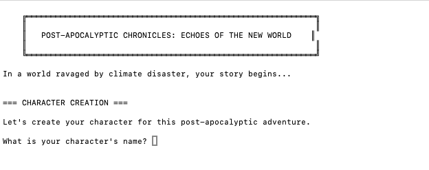I decided I wanted to lock the setting to a post-apocalyptic story and have the initial questions be about the character the user wants. I've also decided to have a memory system to keep track of NPCs, player memories, etc.